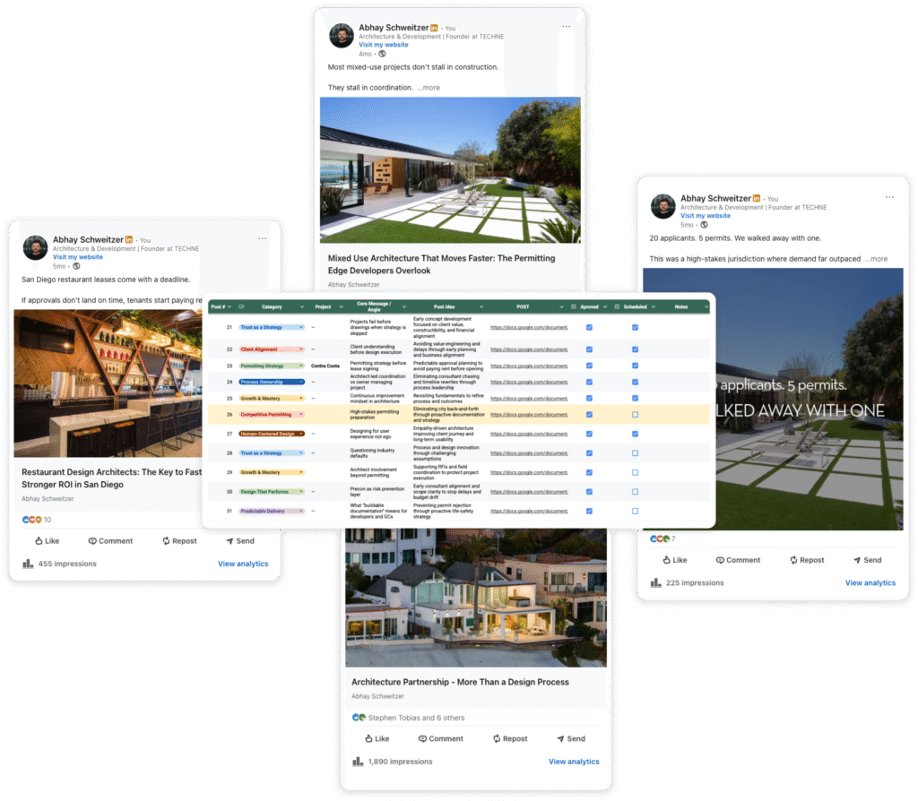 Developers and brokers don’t respond to design-first messaging—they respond to speed, certainty, and ROI. A three-month content strategy was built around five authority pillars: permitting intelligence, ROI-focused design, fire-rated construction, project delivery, and market insight. Content was planned, written, and scheduled on LinkedIn without requiring time from Abhay’s team to produce it.